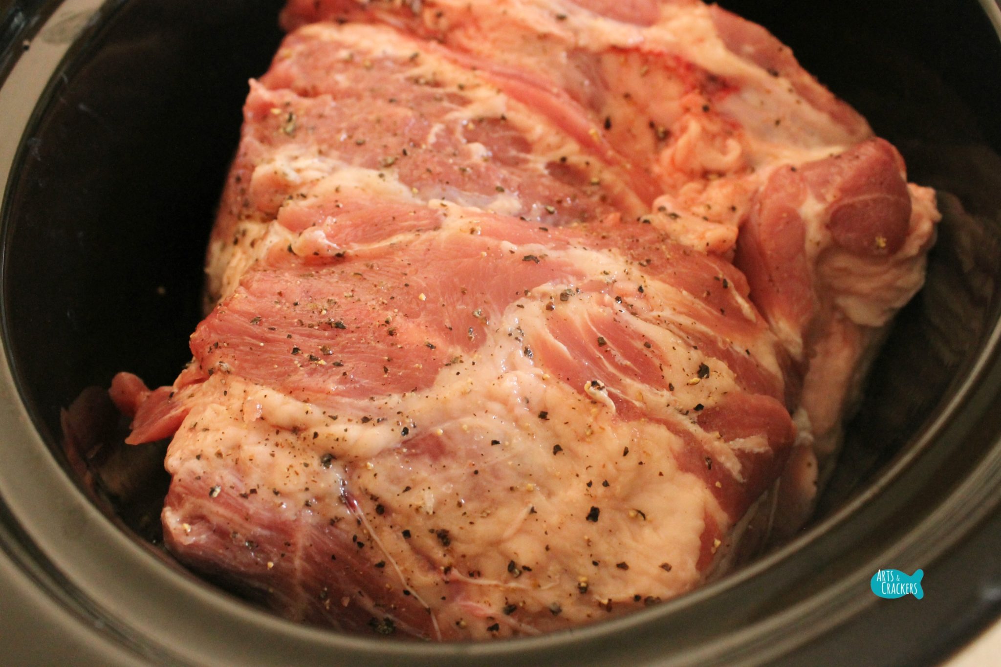 Place the pork into the slow cooker, fat side up.